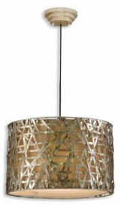 The metal shade is comprised of intertwining strips finished in luminous champagne. The look is contemporary but with global appeal. When choosing details and texture, you can transform a building into a home. This cool version of a chandelier offers ample illumination and style. From the Uttermost Alita lighting collection.